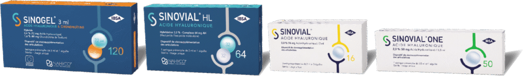 Les produits de la gamme Sinovial® sont indiqués en cas de douleurs ou de mobilité réduites dues à des maladies dégénératives (arthrose par exemple), dans le cas des états post-traumatiques ou des altérations articuleuses ou tendineuses (tendinopathies aigües et chroniques par exemple), que ce soit de grandes (Sinovial®, Sinovial® One, Sinovial® HL, Sinogel®) ou de petites articulations (Sinovial®, Sinovial® HL). Lire attentivement la notice avant utilisation. Ces dispositifs médicaux sont des produits de santé réglementés qui portent, au titre de cette réglementation, le marquage CE (CE0477). Demandez conseil à votre médecin spécialisé. Fabricant : IBSA Farmaceutici Italia. Date de mise à jour du document : Avril 2024